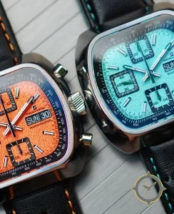 Eine Chronograph-Uhr mit einem markanten 48mm Auftritt am Handgelenk, gefertigt aus Edelstahl mit einem Zifferblatt in türkis und einer besonderen "heavily grained/textured (sandpaper-like)"-Oberfläche.