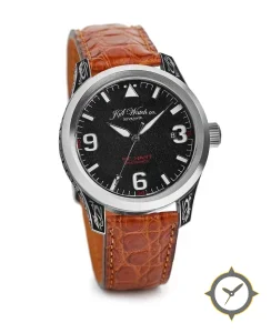 Eine Field-Uhr mit einem 35mm Gehäuse im Vintage-Stil gefertigt aus Edelstahl mit einem Zifferblatt in schwarz und einer besonderen "matte-grain"-Oberfläche.