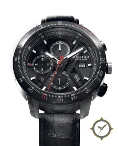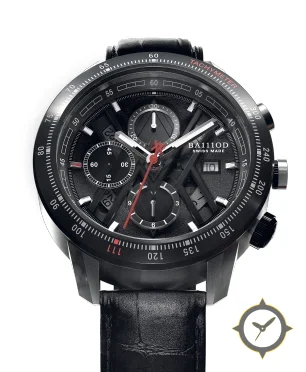 Eine Chronograph-Uhr mit einem vielseitigen 38.5mm Gehäuse, das an fast jedes Handgelenk passt, gefertigt aus Edelstahl mit einem Zifferblatt in schwarz und einer besonderen "skeletonized, multi-layer matte and textured surfaces"-Oberfläche.