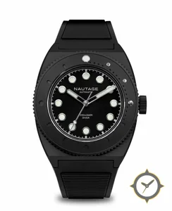 Eine Taucheruhr-Uhr mit einem markanten 42.5mm Auftritt am Handgelenk, gefertigt aus Edelstahl mit einem Zifferblatt in schwarz und einer besonderen "matte"-Oberfläche.