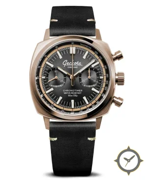 Eine Chronograph-Uhr mit einem 34mm Gehäuse im Vintage-Stil gefertigt aus Bronze mit einem Zifferblatt in grau und einer besonderen "sunburst"-Oberfläche.