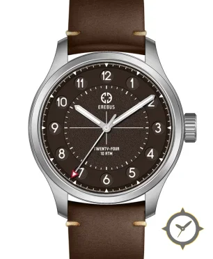 Eine Field-Uhr mit einem 33mm Gehäuse im Vintage-Stil gefertigt aus Edelstahl mit einem Zifferblatt in braun und einer besonderen "grainy"-Oberfläche.