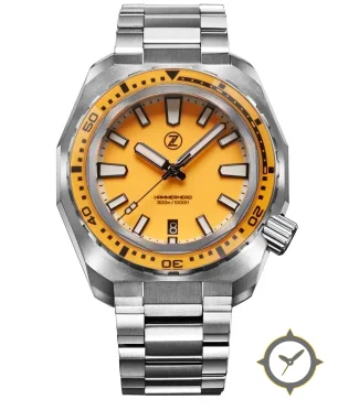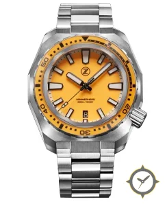 Eine Taucheruhr-Uhr mit einem markanten 50mm Auftritt am Handgelenk, gefertigt aus Edelstahl mit einem Zifferblatt in orange und einer besonderen "matte"-Oberfläche.