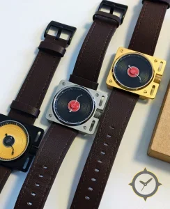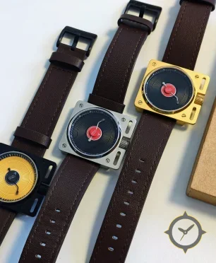 Eine Vintage-Uhr mit einem markanten 46mm Auftritt am Handgelenk, gefertigt aus Edelstahl mit einem Zifferblatt in schwarz und einer besonderen "concentric grooved texture (vinyl/record-style)"-Oberfläche.