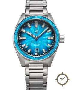 Eine Taucheruhr-Uhr mit einem markanten 48mm Auftritt am Handgelenk, gefertigt aus Edelstahl mit einem Zifferblatt in türkis und einer besonderen "sunburst"-Oberfläche.