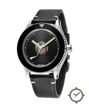 Eine Taucheruhr-Uhr mit einem markanten 43.5mm Auftritt am Handgelenk, gefertigt aus Edelstahl mit einem Zifferblatt in schwarz und einer besonderen "concentric grooves"-Oberfläche.