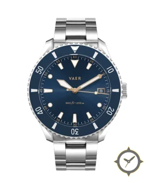 Eine Taucheruhr-Uhr mit einem markanten 43mm Auftritt am Handgelenk, gefertigt aus Edelstahl mit einem Zifferblatt in marineblau und einer besonderen "sunburst"-Oberfläche.