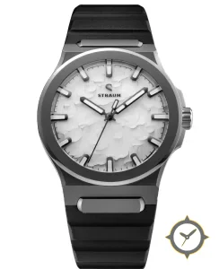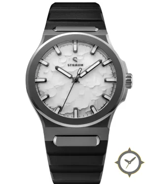 Eine Sport-Uhr mit einem markanten 43mm Auftritt am Handgelenk, gefertigt aus Titan mit einem Zifferblatt in weiß und einer besonderen "layered relief / stone-like textured surface"-Oberfläche.
