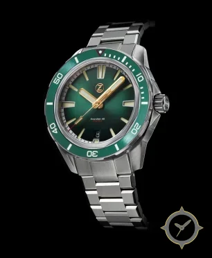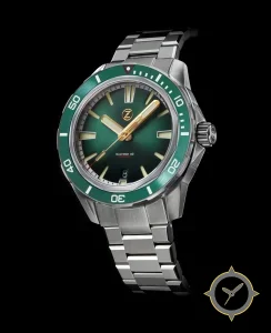 Eine Taucheruhr-Uhr mit einem 34mm Gehäuse im Vintage-Stil gefertigt aus Edelstahl mit einem Zifferblatt in grün und einer besonderen "sunburst"-Oberfläche.