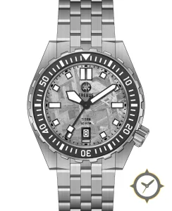 Eine Taucheruhr-Uhr mit einem markanten 48mm Auftritt am Handgelenk, gefertigt aus Edelstahl mit einem Zifferblatt in grau und einer besonderen "meteorite"-Oberfläche.