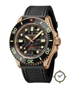 Eine Taucheruhr-Uhr mit einem markanten 43.5mm Auftritt am Handgelenk, gefertigt aus Gold mit einem Zifferblatt in schwarz und einer besonderen "meteorite-style textured finish"-Oberfläche.