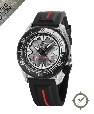 Eine GMT-Uhr mit einem markanten 46mm Auftritt am Handgelenk, gefertigt aus Edelstahl mit einem Zifferblatt in grau und einer besonderen "meteorite-like textured finish with radial brushing"-Oberfläche und einer echten GMT-Funktion, mit der du eine zweite Zeitzone verfolgen kannst.