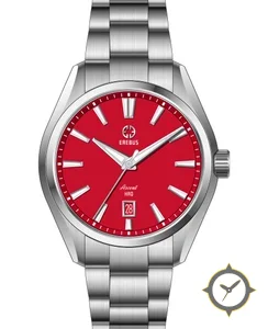 Eine Sport-Uhr mit einem 34.5mm Gehäuse im Vintage-Stil gefertigt aus Edelstahl mit einem Zifferblatt in rot und einer besonderen "lacquer"-Oberfläche.
