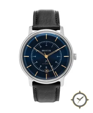 Eine Dress-Uhr mit einem markanten 42mm Auftritt am Handgelenk, gefertigt aus Edelstahl mit einem Zifferblatt in blau und einer besonderen "sunburst"-Oberfläche.