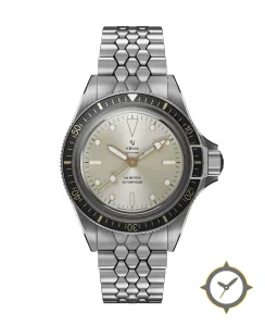 Eine Taucheruhr-Uhr mit einem markanten 41.5mm Auftritt am Handgelenk, gefertigt aus Edelstahl mit einem Zifferblatt in weiß und einer besonderen "sunburst/cream finish"-Oberfläche.