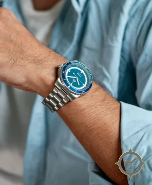 Eine Taucheruhr-Uhr mit einem markanten 47mm Auftritt am Handgelenk, gefertigt aus Edelstahl mit einem Zifferblatt in türkis und einer besonderen "sunburst"-Oberfläche.