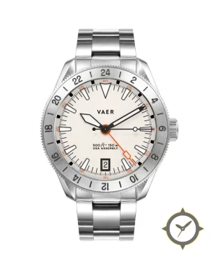 Eine GMT-Uhr mit einem markanten 42mm Auftritt am Handgelenk, gefertigt aus Edelstahl mit einem Zifferblatt in weiß und einer besonderen "matte"-Oberfläche und einer echten GMT-Funktion, mit der du eine zweite Zeitzone verfolgen kannst.