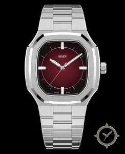 Eine Sport-Uhr mit einem vielseitigen 38mm Gehäuse, das an fast jedes Handgelenk passt, gefertigt aus Edelstahl mit einem Zifferblatt in karmesinrot und einer besonderen "fumé / sunburst gradient"-Oberfläche.