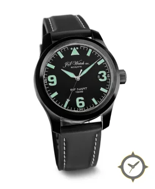 Eine Pilot-Uhr mit einem 36mm Gehäuse im Vintage-Stil gefertigt aus Edelstahl mit einem Zifferblatt in schwarz und einer besonderen "matte"-Oberfläche.