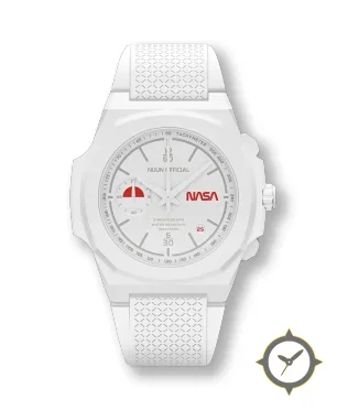 Eine Racing-Uhr mit einem 33mm Gehäuse im Vintage-Stil gefertigt aus Harz mit einem Zifferblatt in weiß und einer besonderen "matte"-Oberfläche.