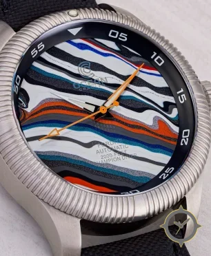 Eine Taucheruhr-Uhr mit einem 37mm Gehäuse im Vintage-Stil gefertigt aus Edelstahl mit einem Zifferblatt in weiß und einer besonderen "glossy, multi-layer enamel-like swirled texture"-Oberfläche.