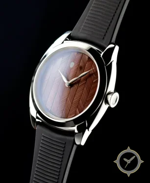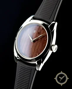 Eine Minimalistisch-Uhr mit einem markanten 44.5mm Auftritt am Handgelenk, gefertigt aus Edelstahl mit einem Zifferblatt in braun und einer besonderen "wood-grain"-Oberfläche.