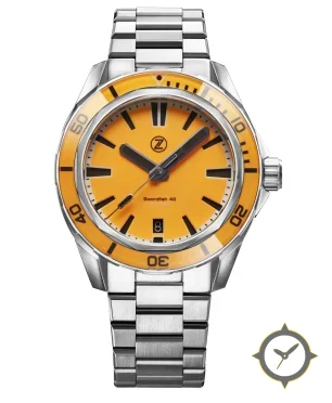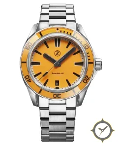 Eine Taucheruhr-Uhr mit einem markanten 42mm Auftritt am Handgelenk, gefertigt aus Edelstahl mit einem Zifferblatt in orange und einer besonderen "matte"-Oberfläche.