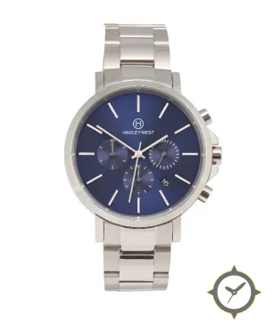 Eine Chronograph-Uhr mit einem markanten 42.5mm Auftritt am Handgelenk, gefertigt aus Edelstahl mit einem Zifferblatt in blau und einer besonderen "sunburst"-Oberfläche.