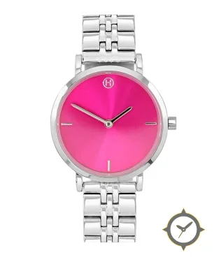 Eine GMT-Uhr mit einem 30mm Gehäuse im Vintage-Stil gefertigt aus Edelstahl mit einem Zifferblatt in karmesinrot und einer besonderen "sunburst"-Oberfläche und einer echten GMT-Funktion, mit der du eine zweite Zeitzone verfolgen kannst.