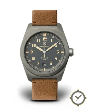 Eine Field-Uhr mit einem markanten 45.5mm Auftritt am Handgelenk, gefertigt aus Titan mit einem Zifferblatt in grau und einer besonderen "matte"-Oberfläche.