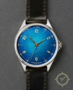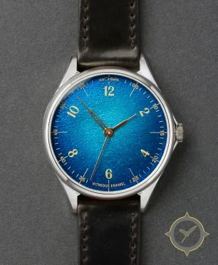 Eine Dress-Uhr mit einem vielseitigen 38.5mm Gehäuse, das an fast jedes Handgelenk passt, gefertigt aus Edelstahl mit einem Zifferblatt in blau und einer besonderen "vitreous enamel, textured/granulated finish"-Oberfläche.