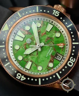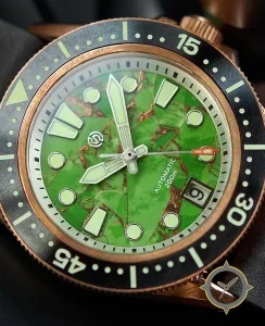 Eine Taucheruhr-Uhr mit einem 34mm Gehäuse im Vintage-Stil gefertigt aus Bronze mit einem Zifferblatt in grün und einer besonderen "marbled"-Oberfläche.