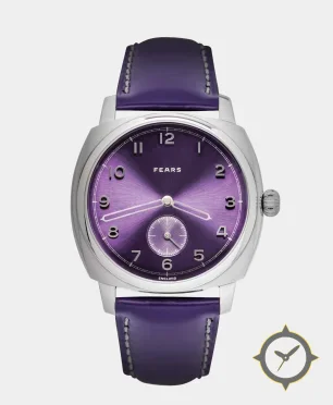 Eine Dress-Uhr mit einem 35.5mm Gehäuse im Vintage-Stil gefertigt aus Edelstahl mit einem Zifferblatt in lila und einer besonderen "brushed sunburst"-Oberfläche.