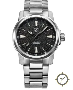 Eine Tool-Uhr mit einem markanten 45mm Auftritt am Handgelenk, gefertigt aus Edelstahl mit einem Zifferblatt in schwarz und einer besonderen "grained / sandblasted texture"-Oberfläche.