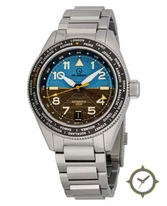 Eine GMT-Uhr mit einem 34mm Gehäuse im Vintage-Stil gefertigt aus Edelstahl mit einem Zifferblatt in blau und einer besonderen "textured-grain (two-tone, upper blue / lower brown)"-Oberfläche, ideal für Weltenbummler dank der Weltzeit-Funktion.