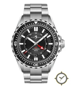 Eine GMT-Uhr mit einem markanten 49.5mm Auftritt am Handgelenk, gefertigt aus Edelstahl mit einem Zifferblatt in schwarz und einer besonderen "horizontal ribbed/guilloche"-Oberfläche und einer echten GMT-Funktion, mit der du eine zweite Zeitzone verfolgen kannst.