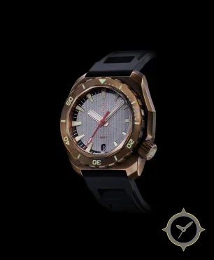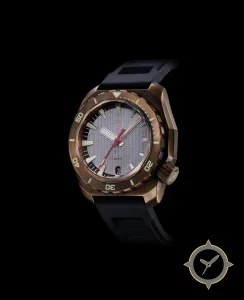 Eine Taucheruhr-Uhr mit einem markanten 50.5mm Auftritt am Handgelenk, gefertigt aus Bronze mit einem Zifferblatt in grau und einer besonderen "vertical brushed / linen-like texture"-Oberfläche.