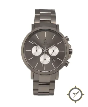 Eine Chronograph-Uhr mit einem markanten 47mm Auftritt am Handgelenk, gefertigt aus Edelstahl mit einem Zifferblatt in grau und einer besonderen "sunburst brushed"-Oberfläche.