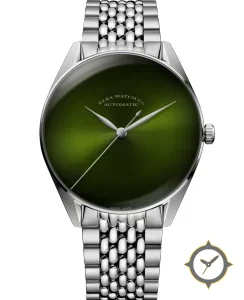 Eine Dress-Uhr mit einem 37mm Gehäuse im Vintage-Stil gefertigt aus Edelstahl mit einem Zifferblatt in grün und einer besonderen "fumé / sunburst (radial gradient)"-Oberfläche.