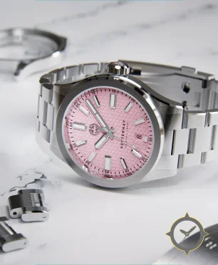 Eine Sport-Uhr mit einem 32mm Gehäuse im Vintage-Stil gefertigt aus Edelstahl mit einem Zifferblatt in rot und einer besonderen "textured guilloché with repeating small triangular pattern"-Oberfläche.