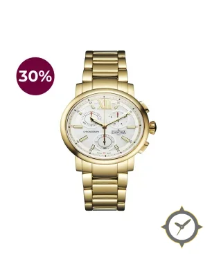 Eine Chronograph-Uhr mit einem 36.5mm Gehäuse im Vintage-Stil gefertigt aus Gold mit einem Zifferblatt in weiß und einer besonderen "lacquer"-Oberfläche.