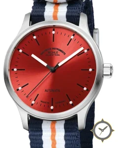 Eine Minimalistisch-Uhr mit einem 37mm Gehäuse im Vintage-Stil gefertigt aus Edelstahl mit einem Zifferblatt in rot und einer besonderen "radial sunburst"-Oberfläche.