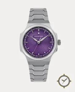 Eine Luxus-Uhr gefertigt aus Edelstahl mit einem Zifferblatt in lila und einer besonderen "guilloché"-Oberfläche.
