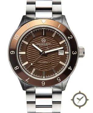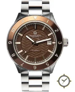 Eine Taucheruhr-Uhr mit einem markanten 50.5mm Auftritt am Handgelenk, gefertigt aus Edelstahl mit einem Zifferblatt in braun und einer besonderen "wavy"-Oberfläche.