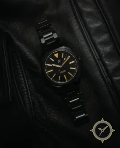 Eine Sport-Uhr mit einem 37.5mm Gehäuse im Vintage-Stil gefertigt aus Edelstahl mit einem Zifferblatt in schwarz und einer besonderen "matte"-Oberfläche.