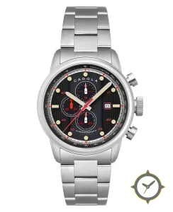 Eine Chronograph-Uhr mit einem markanten 46mm Auftritt am Handgelenk, gefertigt aus Edelstahl mit einem Zifferblatt in schwarz und einer besonderen "vertical striped (ribbed)"-Oberfläche.