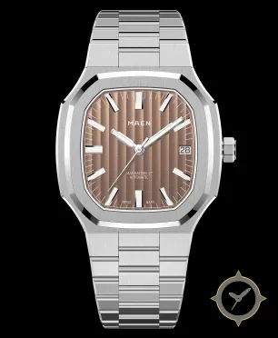 Eine Sport-Uhr mit einem 32mm Gehäuse im Vintage-Stil gefertigt aus Edelstahl mit einem Zifferblatt in braun und einer besonderen "vertical ribbed / guilloché"-Oberfläche.