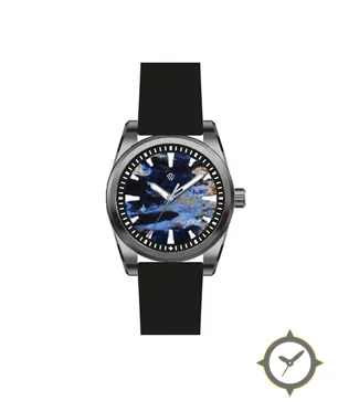 Eine Field-Uhr mit einem 32mm Gehäuse im Vintage-Stil gefertigt aus Edelstahl mit einem Zifferblatt in blau und einer besonderen "marbled/stone texture"-Oberfläche.