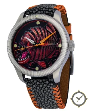 Eine Taucheruhr-Uhr mit einem 37mm Gehäuse im Vintage-Stil gefertigt aus Edelstahl mit einem Zifferblatt in schwarz und einer besonderen "printed illustration / glossy"-Oberfläche.