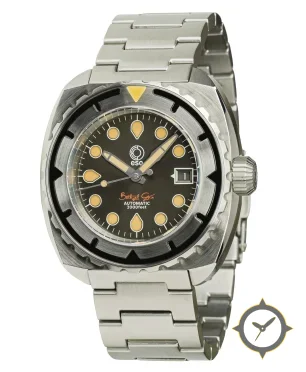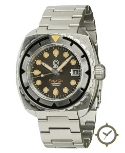 Eine Taucheruhr-Uhr mit einem 37.5mm Gehäuse im Vintage-Stil gefertigt aus Edelstahl mit einem Zifferblatt in schwarz und einer besonderen "matte"-Oberfläche.